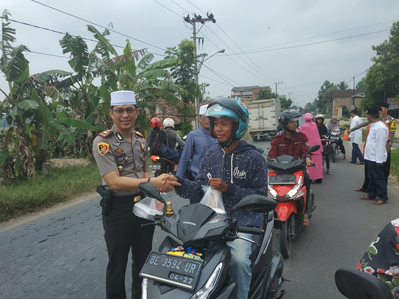 BINTANGPOST : Sebagai bentuk kepedulian kepada pengendara yang melintas di ruas jalan raya kecamatan Sukoharjo Kabupaten Pringsewu dibulan suci ramadhan. Polsek Sukoharjo Polres Tanggamus bersama Bhayangkari polsek setempat membagi-bagikan takjil secara gratis, Sabtu (11/5/2019).