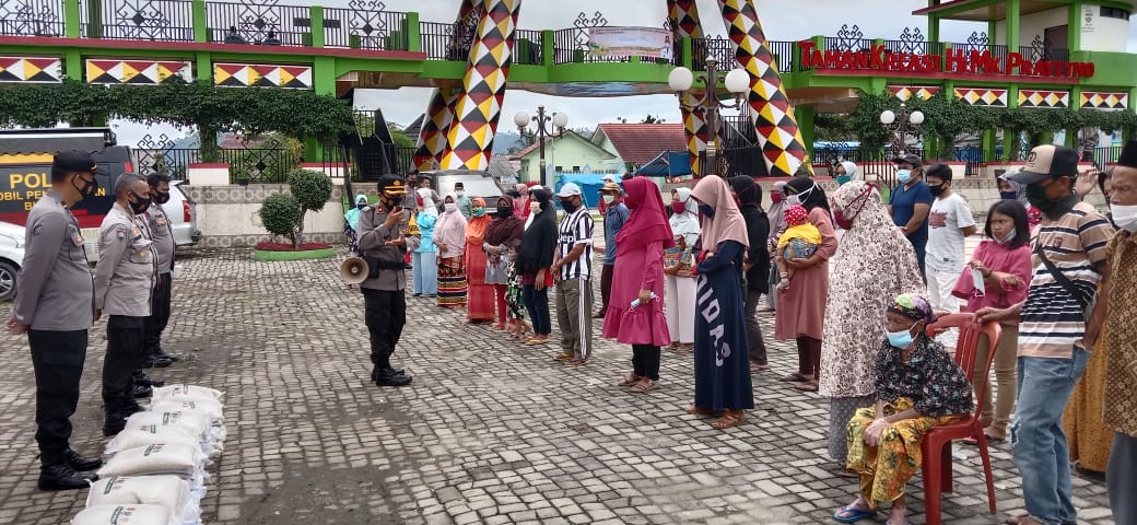 TANGGAMUS-BINTANGPOST : Puluhan warga kurang mampu dan anak yatim piatu menerima bantuan sosial (Bansos) Polres Tanggamus yang diserahkan di Pos Pam Rest Area Gisting, Selasa (22/12/20).