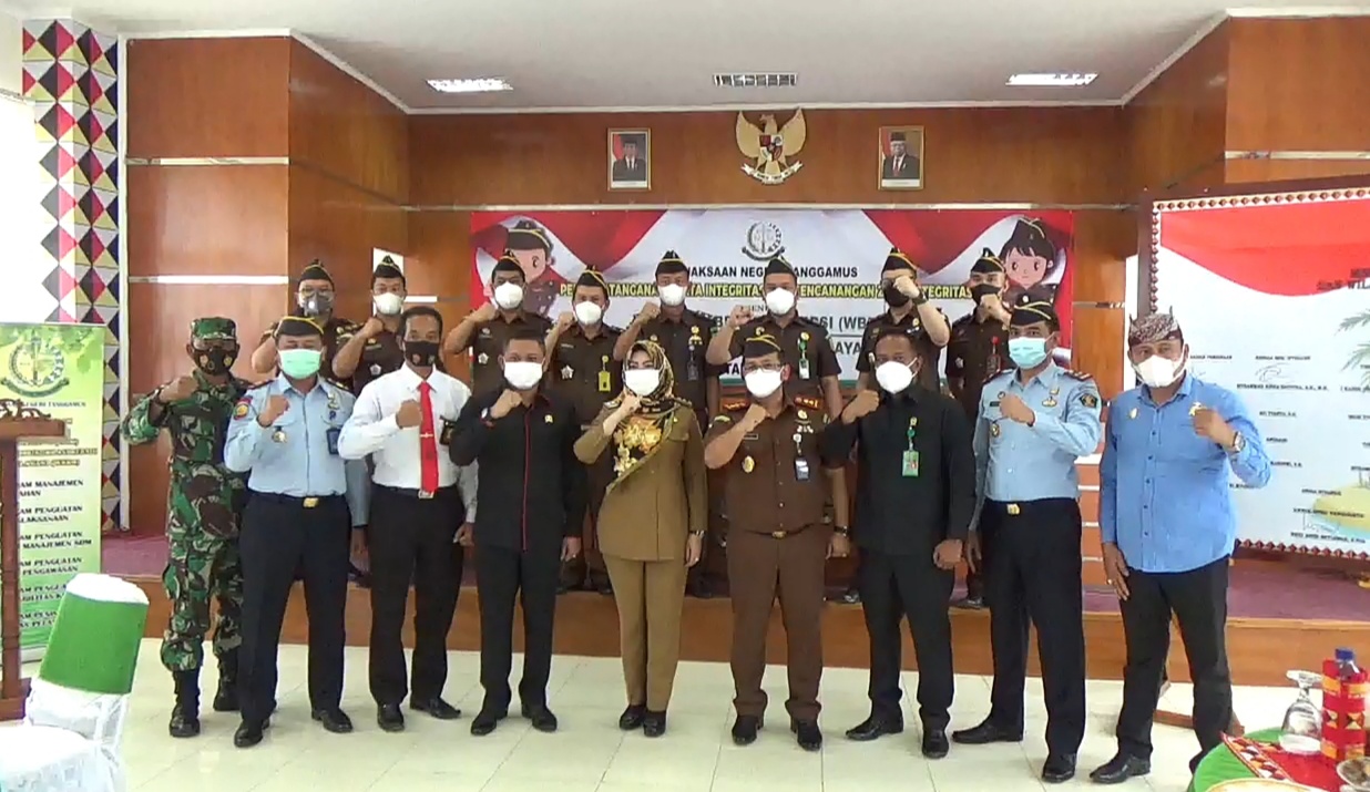TANGGAMUS-BINTANGPOST : Kejaksaan Negeri (Kejari) Tanggamus menggelar acara Penandatanganan Pakta Integritas dan Pencanangan Zona Integritas Menuju Wilayah Bebas Korupsi (WBK) dan Wilayah Birokrasi Bersih Melayani (WBBM) di Aula Kantor Kejari setempat, Selasa 30 Maret 2021.