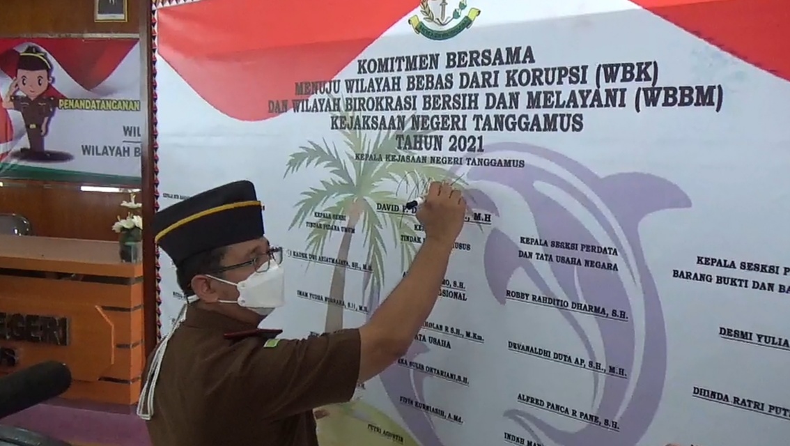 Kepala Kejari (Kajari) Tanggamus David P. Duarsa mengatakan, kegiatan itu merupakan komitmen seluruh jajaran pegawai kejari untuk bersama-sama satu persepsi dalam rangka melaksanakan Wilayah Bebas Korupsi dan Wilayah Birokrasi Bersih melayani tahun 2021 ini.