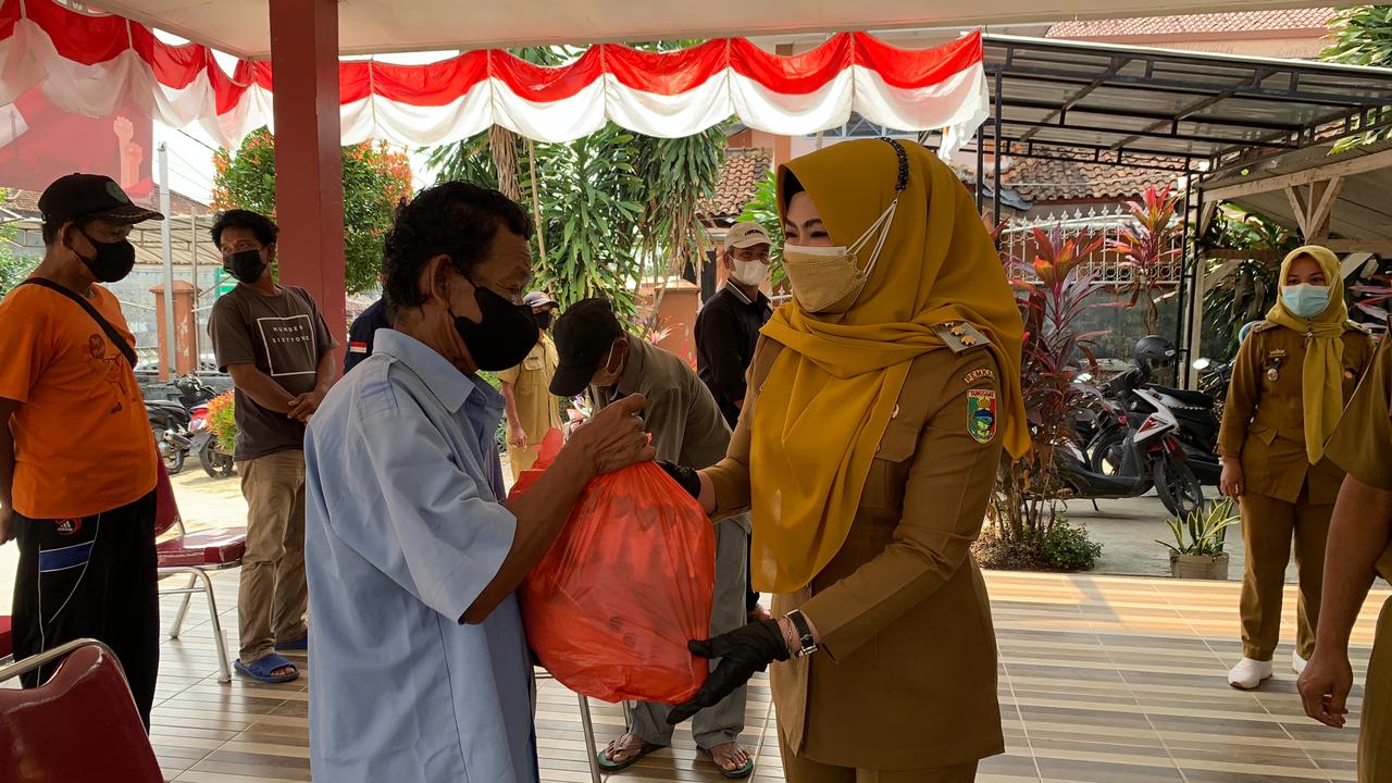 TANGGAMUS-BINTANGPOST : Bupati Tanggamus Dewi Handajani kembali memberikan bantuan secara simbolis kepada petugas kebersihan yang ada di dua kecamatan, yaitu Kecamatan Talang Padang dan Gisting, Senin (2/8/2021).