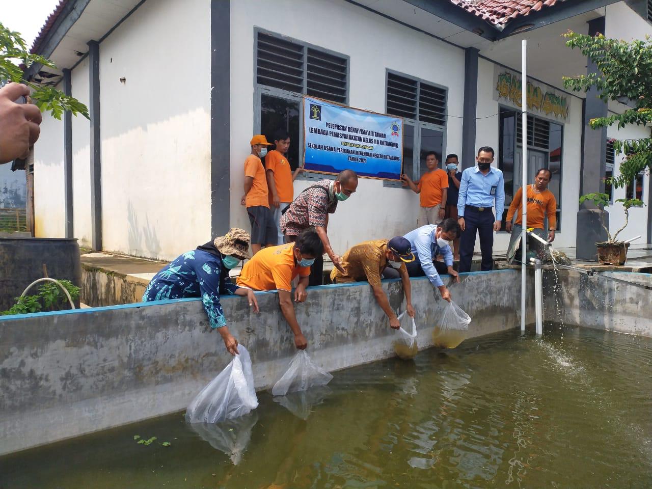 TANGGAMUS-BINTANGPOST : Sebanyak 5000 ekor benih ikan nila milik Lapas Kotaagung ditaburkan secara langsung oleh Kalapas Kotaagung dan Wakil Kepala Sekolah SUPM Negeri Kota Agung, Kurman, kedalam kolam yang nantinya akan di budidayakan oleh Warga Binaan Lapas Kotaagung.