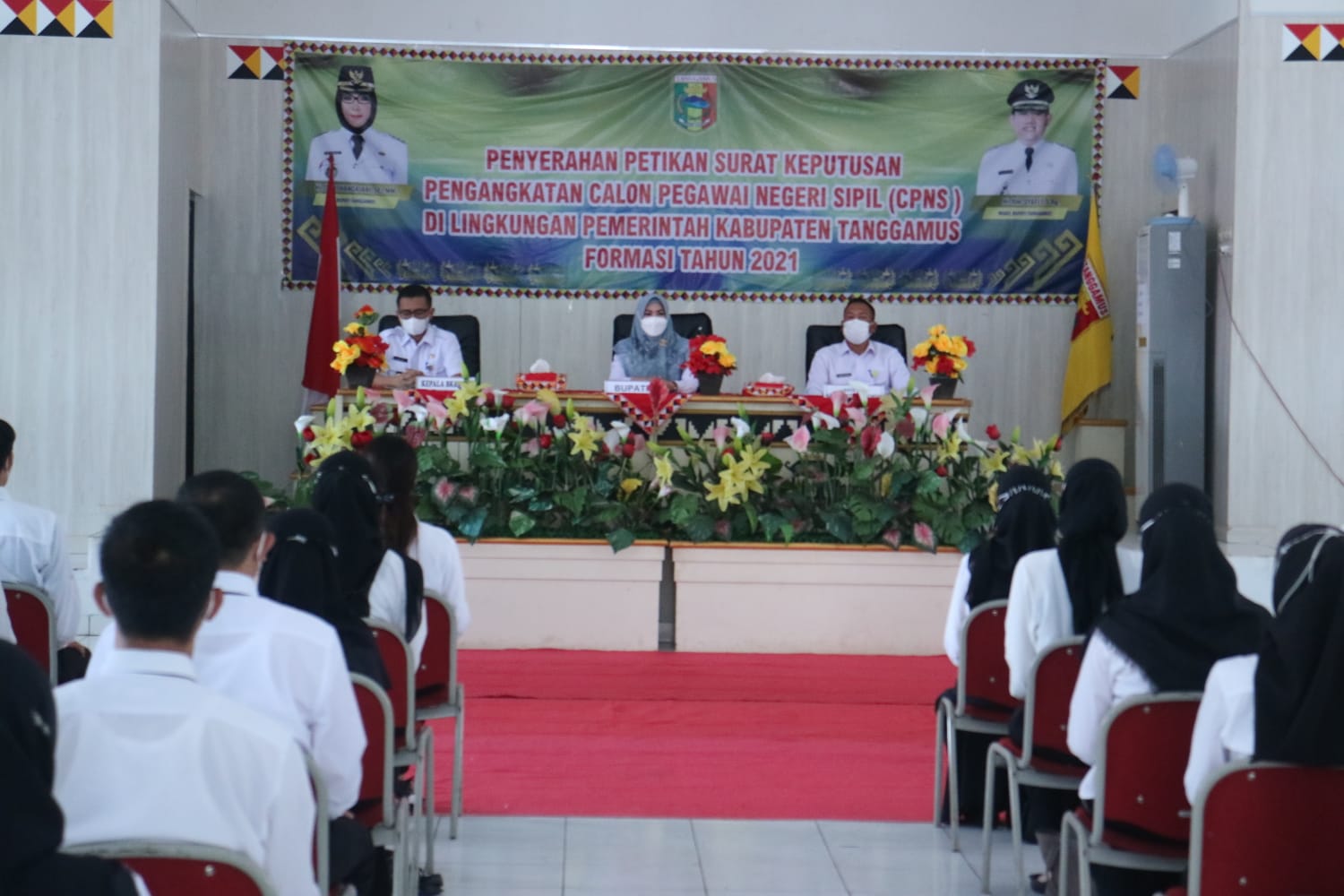 SK CPNS untuk Formasi tahun 2021 ppemkab Tanggamus ini, berlangsung di Aula Gedung Serba Guna (GSG) Islamik Center Kecamatan Kota Agung, kabupaten setempat, Kamis (14/4/2022).