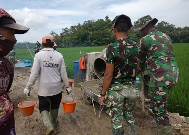Pesawaran (BP) : Pekerjaan rabat beton dalam program TMMD ke-127 yang dilaksanakan Satgas Kodim 0421/Lampung Selatan terus menunjukkan progres positif.